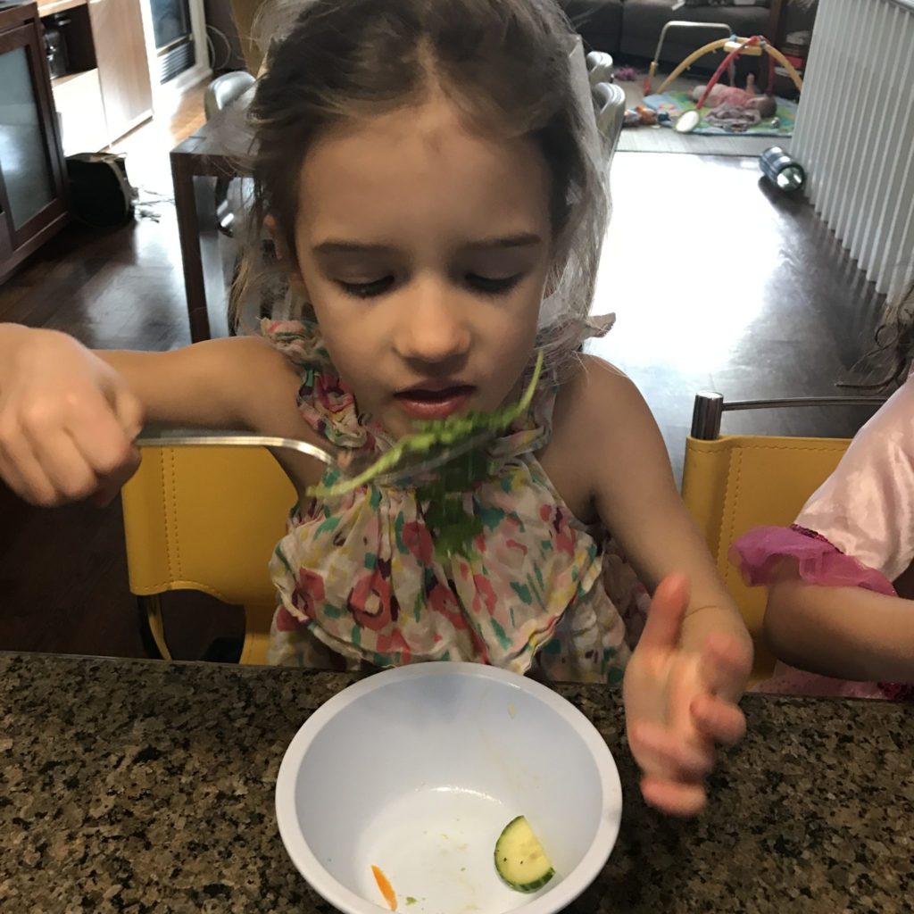 When she asked “Mommy can I have some of this?” it took every ounce of me not to show my excitement (or cry) given it wasn’t even a kid-friendly salad! I nonchalantly said “sure” and she scooped some greens on her plate, then ate one leaf, and eventually the whole scoop. After dinner, she came back and asked to have the leftover (and soggy?!) salad for her bedtime snack. Again, another nonchalant “sure” from me (while having a party inside).