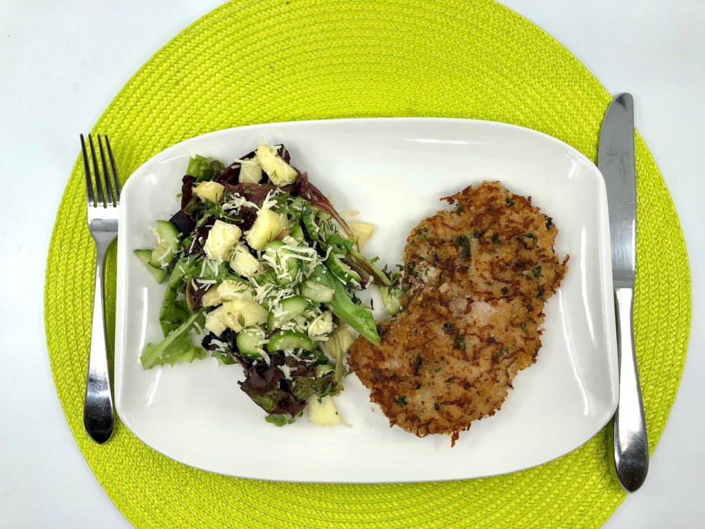 Pork Schnitzel with Apple, Dill, and Parmesan Salad