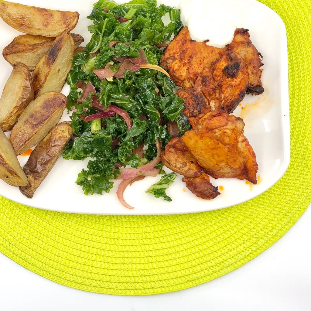 Portuguese-Style Chicken with Potato Wedges and Pickled Red Onion Kale Salad